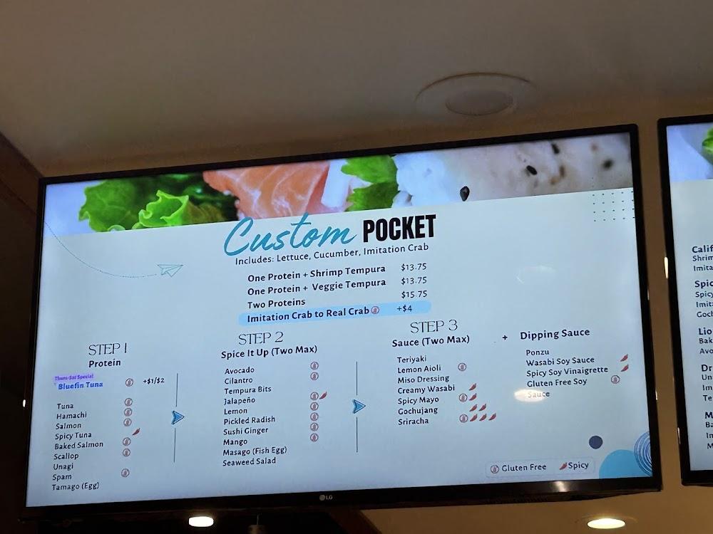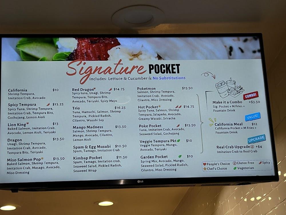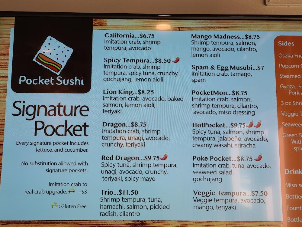 Pocket Sushi's menu focuses on fun and innovative sushi creations. Signature items like the Dragon and Lion King pockets stand out. Diners can create customizable pockets, filled with fresh ingredients and tasty proteins. Options range from veggie tempura to various proteins, ensuring something for everyone. The menu also features sushi dynamite selections, perfect for quick bites. Each dish reflects a commitment to quality, freshness, and flavor. Side options include fries and edamame, enhancing your meal experience. Whether dining in or taking out, savory choices await at Pocket Sushi. The menu's casual presentation allows for unpretentious enjoyment of great cuisine.